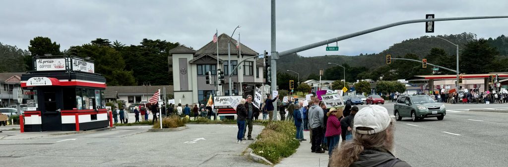 Hundreds of people showed up for the second set of protests in April, this time centered around downtown Half Moon Bay. Groups gathered on all four corners of the intersection of Route 92 and Main Street, as well as at Highway 1 and North Main Street.