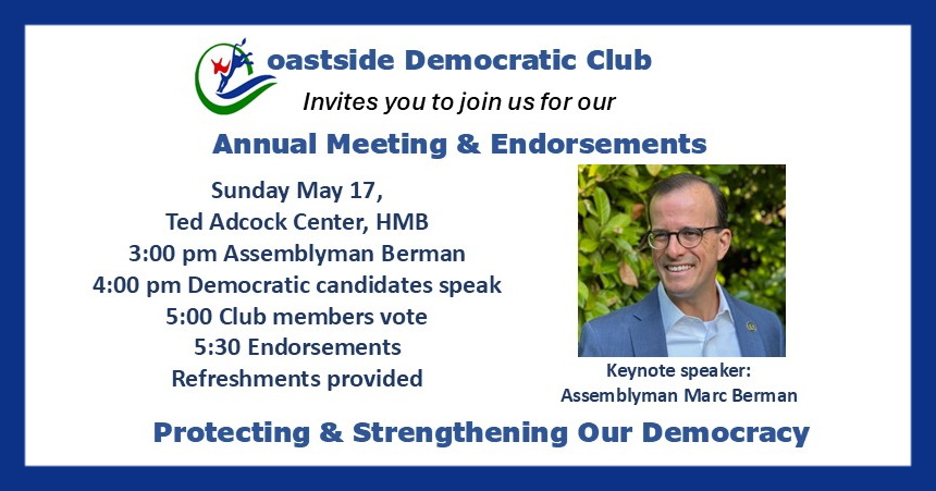 Please join us for the Annual Meeting at 3 pm on May 17th at the Ted Adcock Center in Half Moon Bay. Assemblyman Berman will speak first, followed by candidates seeking our endorsement.